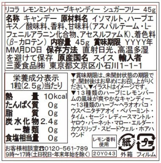 リコラ利口樂 レモンミント ハーブキャンディー 45g【在庫限り】
